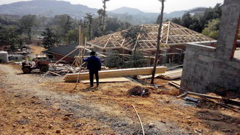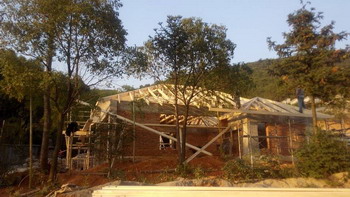 2014年10月12日公司无锡项目部在完成了虹桥花园庭院木屋抬高工程后,进驻宜兴木屋顶木外装工程现场开工,该工程混凝土框架梁柱已完成施工,我司在此基础上完成木结构屋顶和木结构外墙装饰工程,施工结束将达到我司与该客户去年完成的一栋木结构会所一样的外部效果。本次工程由三栋建筑组成,工期一个月。日前工程顺利进展,已完成屋面结构工程和一栋屋面的瓦片安装。